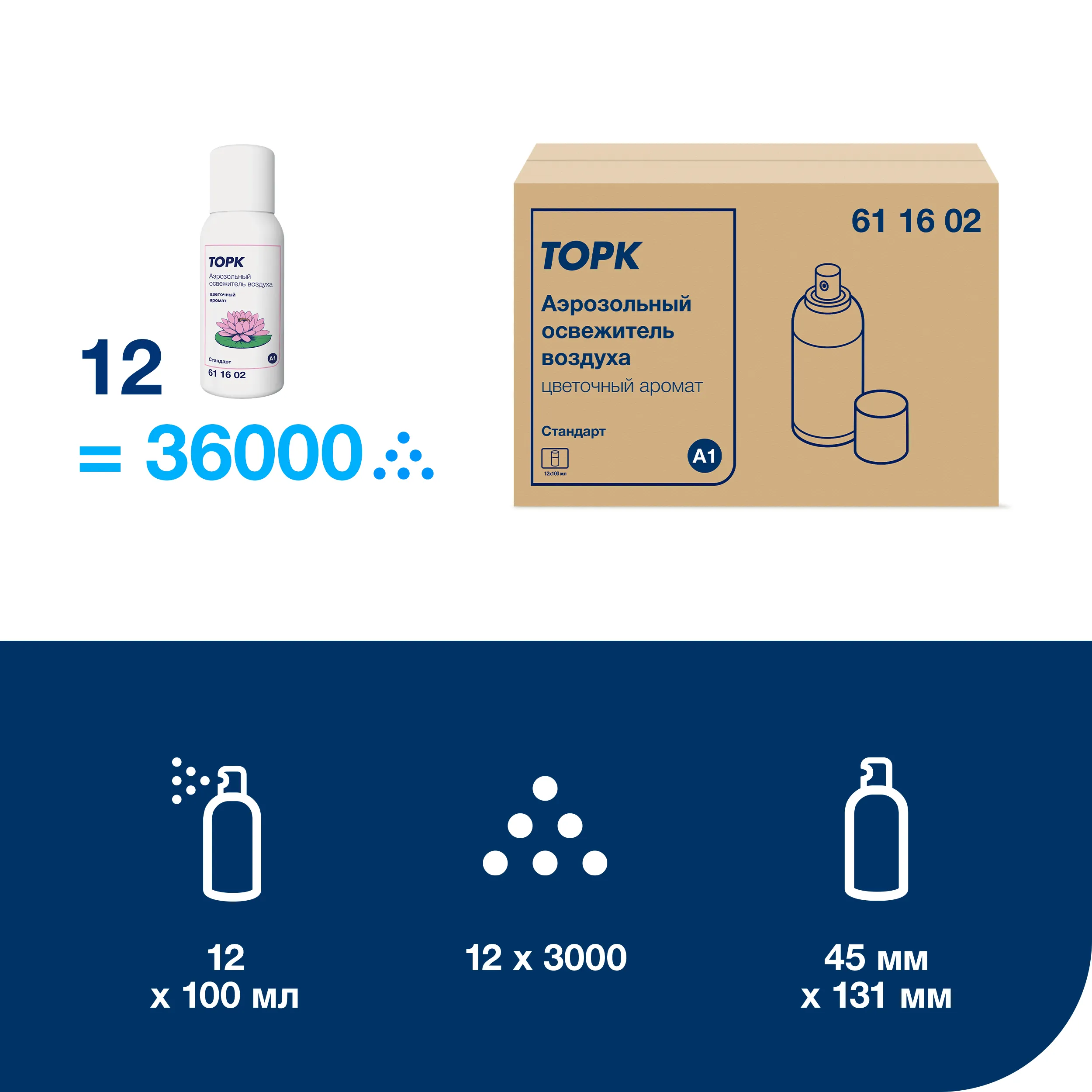 Освежитель воздуха аэрозольный цветочный аромат TORK (12 шт/кор), арт 611602 100 мл до 3000 порций, Не содержит вещества, разрушающие озоновый слой, безопасен для человека и природы Свежий аромат дарит ощущение чистоты. Предназначен для использования в диспенсерах Tork |