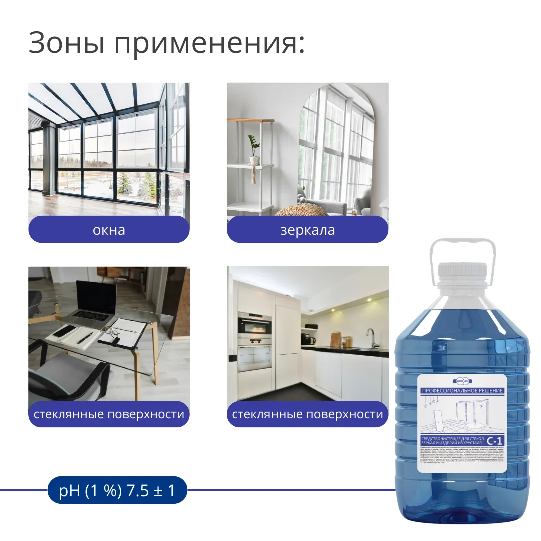 Средство чистящее С-1 для стекол, зеркал и изделий из хрусталя, 5 л, РБ, арт С-1 5000 Универсальное средство для очистки стекла и глянцевых поверхностей. Водородный показатель, рН (1 %) 7,5 ± 1. |