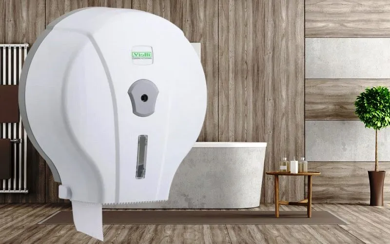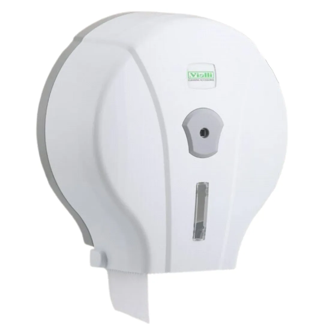 Диспенсер туалетной бумаги Vialli MJ1. Встроенный замок. Смотровое окно для контроля за остатком бумаги. Подходят рулоны диаметром до 19 см. Диспенсер предназначен для использования в общественных местах. Крепится к стене и имеет удобный размер, легко заправить расходный материал. Пластиковый корпус позволяет содержать диспенсер в чистоте. Держатель для туалетной бумаги в больших рулонах может быть как с логотипом Vialli, так и с логотипом Oceanica. Виалли, океаника.