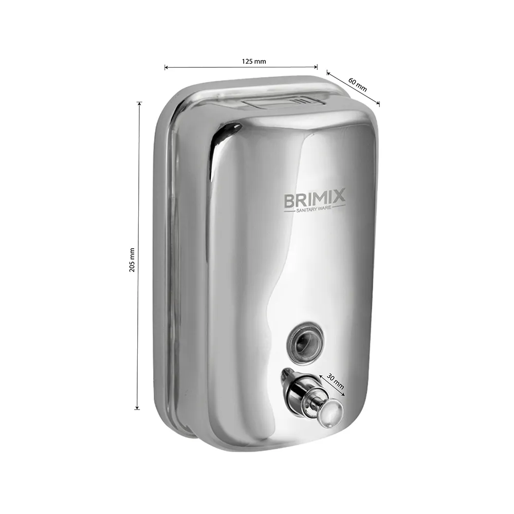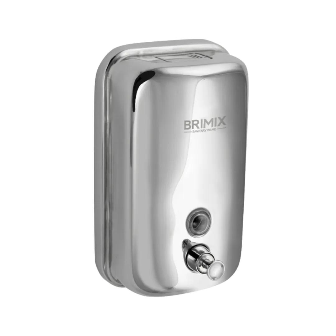 Механический дозатор для жидкого мыла BRIMIX хромированный, для установки в разных санитарно-гигиенических комнатах. Достаточно нажать на кнопку для получения порции средства. Для удобства контроля за уровнем мыла на лицевой стороне есть смотровое окно. Корпус из нержавеющей стали, выдерживает разные механические воздействия. Резервуар емкостью 1000 мл подходит для жидкого мыла и др. средств. Диспенсер настенный. Подходит для гостиниц, кафе, столовых и других общественных мест.