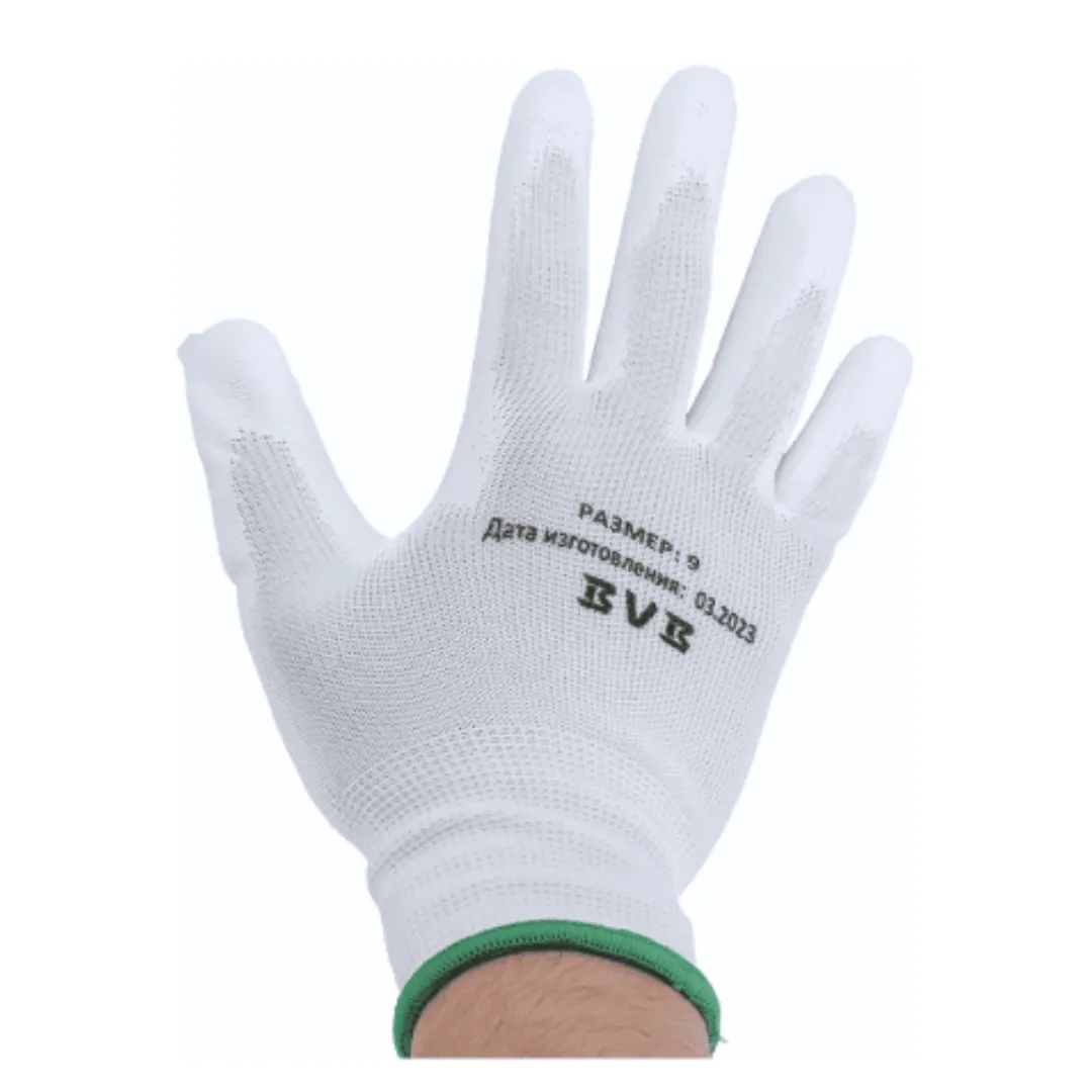 Перчатки на бесшовной «дышащей» основе из полиэстера с плотностью вязки 10 петель на дюйм (10 класс вязки) обеспечивает великолепную тактильную чувствительность! Полиуретановое покрытие обеспечивает отличный захват на поверхностях любого вида. Эти перчатки предназначены для легких и тонких операций в сухих средах, для выполнения которых требуется максимальная чувствительность рук. Анатомическая форма нейлоновой перчатки обеспечивает возможность точного манипулирования мелкими предметами. Перчатки не оставляют отпечатков пальцев и ворсинок, что немаловажно для многих производств. Двойной оверлок с латексным кольцом обеспечивает превосходную фиксацию перчатки на запястье