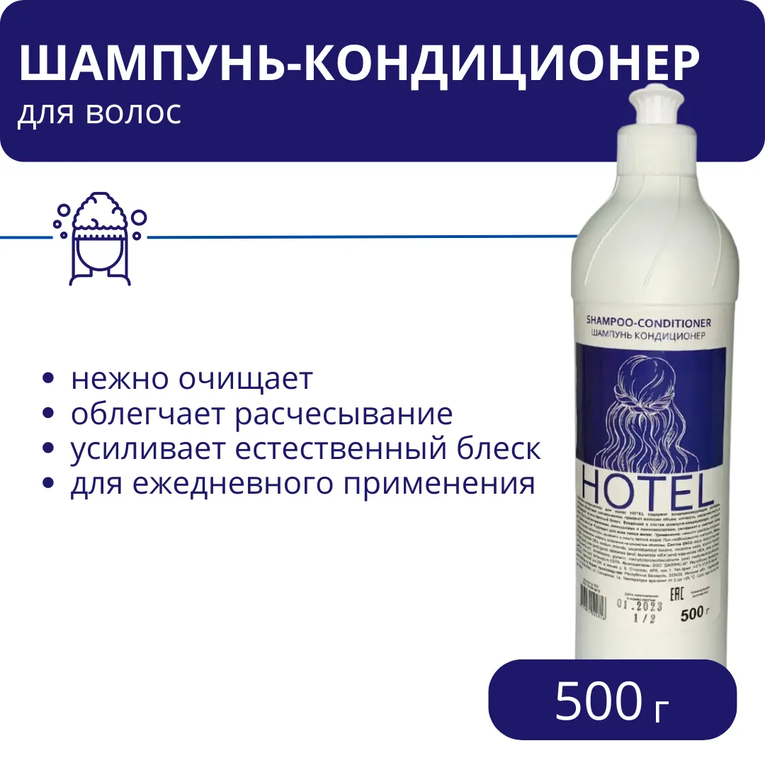 Шампунь-кондиционер "Hotel", 500 г, РБ, арт Ш 500 Густой шампунь с легким ароматом цветущего луга. Без красителей. |