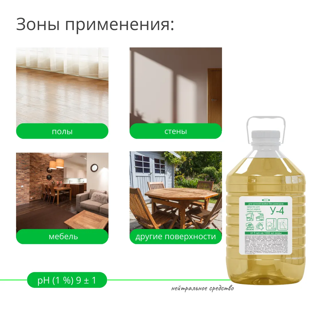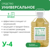 Жидкое высокоэффективное концентрированное средство У4 для уборки поверхностей, требующих особого внимания. Устраняет любые бытовые загрязнения, защищает, придает блеск, не оставляет разводов. Средство "У 4" пригодно к использованию в жесткой воде. Очищенные поверхности не требуют повторной обработки или вытирания.