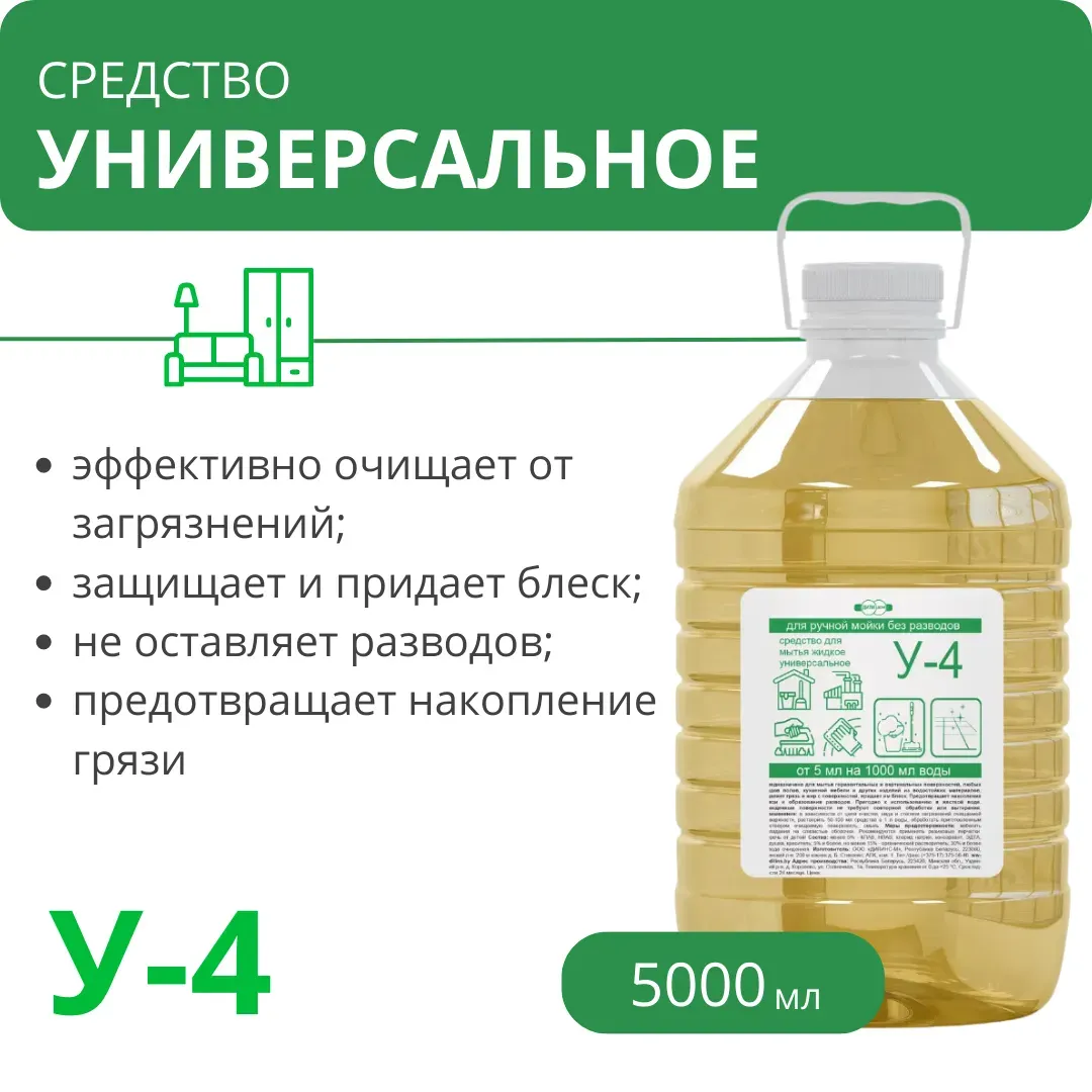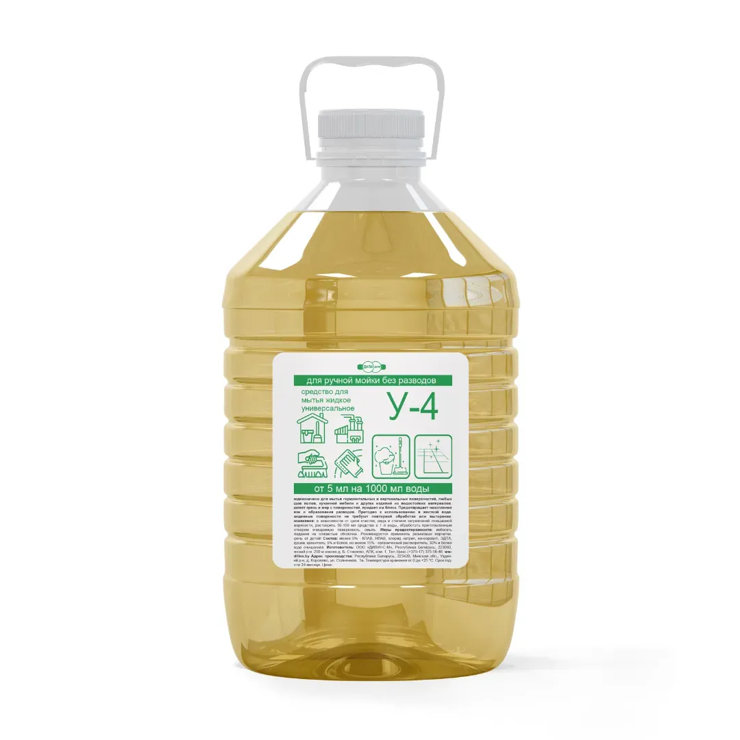 Средство для мытья жидкое универсальное У-4, 5 л(*5,10 кг), РБ, арт У-4 5000 Жидкое, высокоэффективное, концентрированное средство для поверхностей, требующих особого внимания. Устраняет любые бытовые загрязнения, защищает, придает блеск, не оставляет разводов. Водородный показатель, рН (1 %) 9 ± 1. |