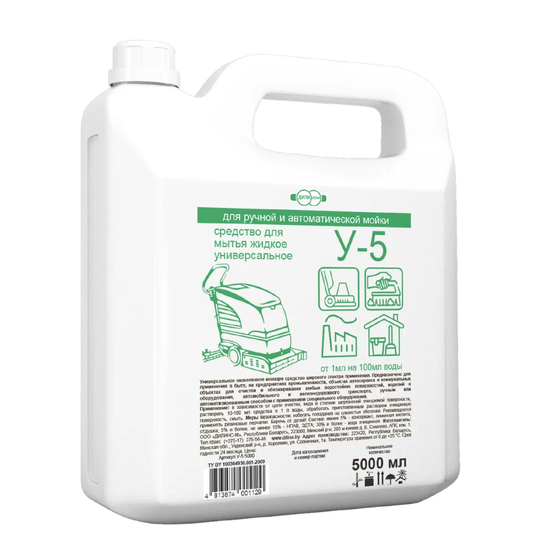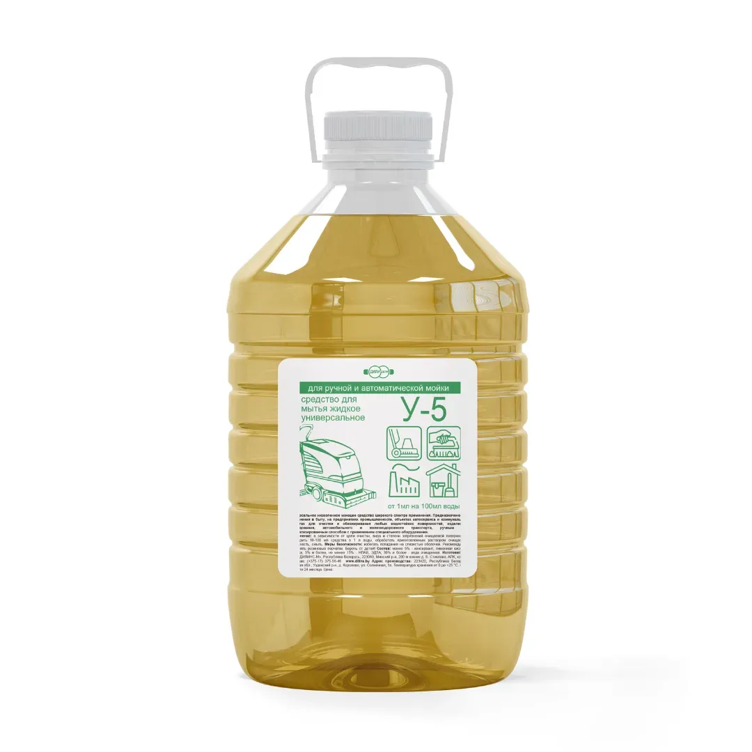 Средство для мытья полов, стен и других твердых водостойких поверхностей с пониженным пенообразованием У5 широкого спектра применения (для ручной и автоматической мойки в поломоечных машинах). Предназначено для применения в быту, на предприятиях промышленности, объектах автосервиса и коммунальных объектах для очистки и обезжиривания любых водостойких поверхностей, изделий и оборудования, автомобильного и железнодорожного транспорта, ручным или автоматизированным способом с применением специального оборудования. Предотвращает накопление грязи на очищенных поверхностях. Средство У 5 не содержит щелочей. Пригодно к использованию в жёсткой воде. Обеспечивает качественное удаление грязи, жира, масел, дорожной пленки.